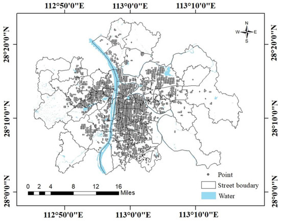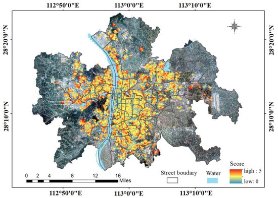 Distribution of activity areas. Open activity can enhance human comfort. Research [60] has shown that open, green spaces have a positive impact on the quality of urban life. Douglas et al. [61] surveyed 483 residents living in three communities in Dublin, Ireland, and found that open, green spaces are important predictors of high community satisfaction. The presence of neighborhood green spaces, such as parks and woodlands, is associated with better physical health, lower rates of certain categories of disease, and lower levels of depression. In addition, the study by Ambrey and Fleming [62] showed that a neighborhood surrounded by water is an exciting place to live. Malambo et al. [50] found that the presence of sports and recreational facilities can increase the physical activity of residents. Therefore, the presence of an activity area often leads to people’s positive assessment of the environment. In this paper, rivers, lakes, green spaces, and playgrounds, which are common factors of urban-life satisfaction, were selected as activity-space elements. In our defined criteria, the presence of these activity areas was positively correlated with the evaluation results.