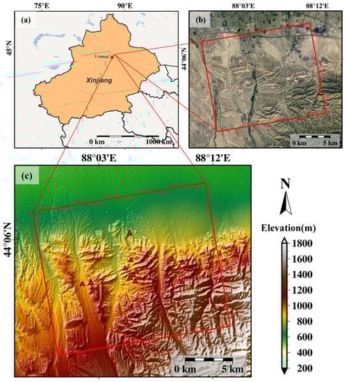 Sketch map of the study area. (a) Shows the geographical location of study area, (b) is optical image and (c) is DEM over the study area derived from SRTM data. The red box indicates the detection range of ground deformation in (b,c). The red triangles in (c) represent the detected coal fire points.