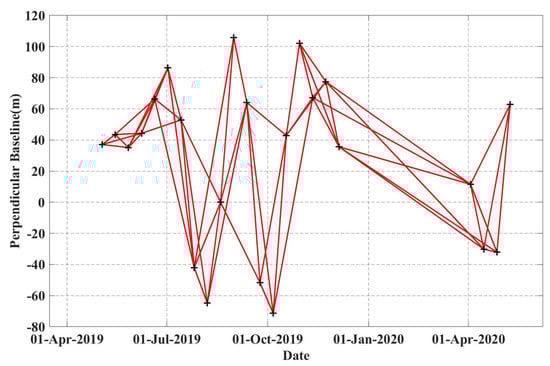 Temporal and perpendicular baseline distribution of the acquisitions used in this study. Plus symbols represent the acquisitions and red lines denote the interferometric pairs used to form interferograms. The perpendicular baseline was set to be within 150 m, and the maximum temporal baseline was 144 days.