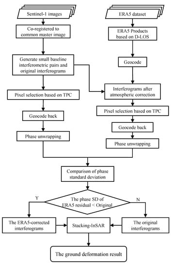 As shown in Figure 3, an adaptive ERA5-Corrected Stacking-InSAR method is proposed in this paper. Its main steps include: