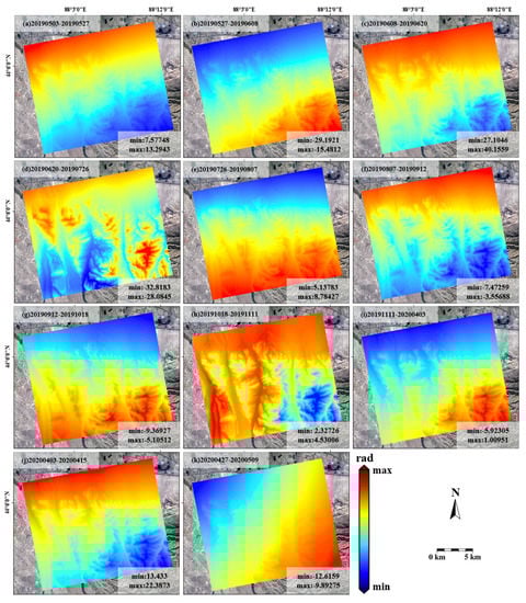 Figure 4 shows a part of the atmospheric delay products, namely atmospheric phase screen (APS) estimated using ERA5 based on the D-LOS model. It can be found that the phase of atmospheric delay is different in different periods. Furthermore, the distribution of atmospheric delay is related to the topography of the study area. The APS using ERA5 based on the D-LOS model is removed from the original interferogram to obtain the interferogram after atmospheric correction.