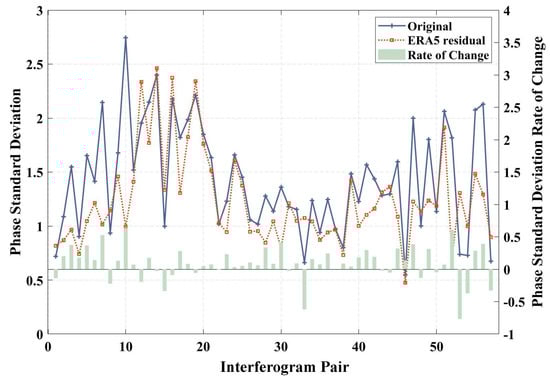 Phase standard deviation of original interferogram and ERA5 residual interferogram. The light green bar represents the Original−Residual/Original rate of phase standard deviation change. The positive value represents the decrease in standard deviation.