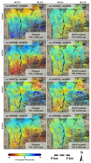 Phase comparison between original interferograms and ERA5 residual interferograms after TPC selection. (a,c,e,g) represents the original interferogram of 20190527–20190608, 20190608–20190620, 20190726–20190807 and 20200403–20200415, respectively. (b,d,f,h) represents the interferogram with residual phase after atmospheric correction of corresponding time, respectively.