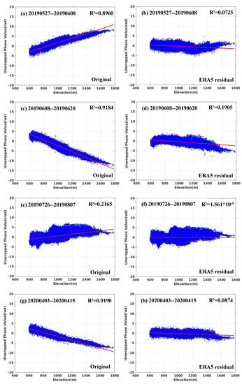 Unwrapped phase-elevation scatter plots for original phase and ERA5 residual phase. (a,c,e,g) represents the original phase-elevation of 20190527–20190608, 20190608–20190620, 20190726–20190807 and 20200403–20200415, respectively. (b,d,f,h) represents the residual phase-elevation of corresponding time, respectively.