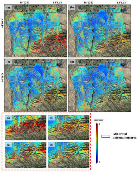 In this paper, 57 original interferograms were first used for Stacking-InSAR (referred to as Original Stacking-InSAR) to obtain the average deformation velocity in the LOS direction of the study area, as shown in Figure 9a. Negative LOS values indicate movement away from the satellite, while positive values indicate movement toward the satellite. The red triangle in the figure represents the location of the coal fire point, and the area circled by the black box is the main coal fire deformation area. It can be seen that there is visible deformation around most coal fire points, while the deformation trend around some coal fire points is not significant. A large area of abnormal deformation is shown in the red box in the southeastern part of the study area, which is magnified as shown in Figure 9e. According to Figure 1c, there is a mountainous area with a high altitude. Therefore, it is highly likely to be affected by the atmosphere. The topography-related tropospheric delay exists in the interferograms in this region, which leads to the anomaly of the average velocity.