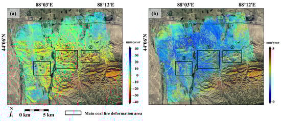 The results of GACOS-Corrected Stacking-InSAR. (a) is deformation monitoring result and (b) is standard deviation of the LOS velocity. The black boxes in (a) indicate the three main coal fire deformation areas over the study area.