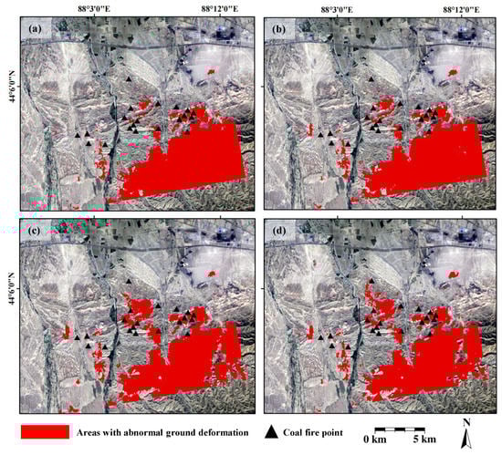 In Section 4.2 above, four groups of deformation results in the study area were obtained. Kriging interpolation was performed. The mean value minus standard deviation of the four groups of interpolated raster images was used as the threshold to recognize the deformation anomalies. As shown in Figure 12, the red area is the deformation anomalies, and the black triangles show the detected coal fire points. Figure 12a–d shows the deformation anomalies identified by Original Stacking-InSAR result, Original ERA5-Corrected Stacking-InSAR result, Original ERA5-Corrected Stacking-InSAR result and Adaptive ERA5-Corrected Stacking-InSAR result, respectively. With the improvement of Stacking-InSAR results, the deformation abnormal areas obtained by the southeastern division of the study area decrease. The coincidence with the detected coal fire points gradually increase. Many deformation studies [] in mining areas show that ground cracks generally appear in places with large curvatures, but not in places with maximum deformation. Normally, coal fire points are marked near ground cracks. Thus, the location of coal fire point and deformation anomaly area is not highly consistent.