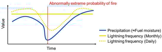Conceptual illustration of potential overestimations of fire caused by the monthly lightning frequency and daily weather.