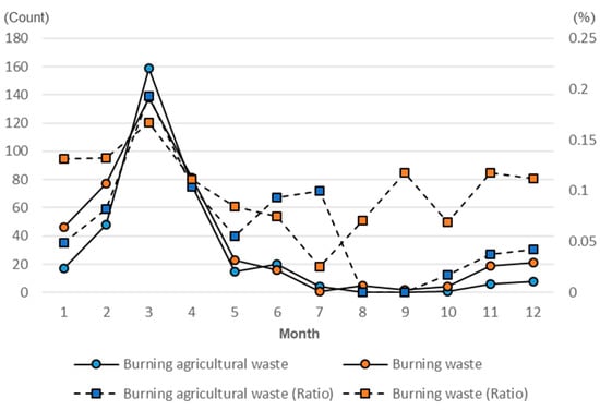 Warm and dry weather during the spring season of South Korea results in a special pattern of forest fires, with more than 60% concentrated in a quarter of the year, from February to April. However, the fire season results not from dry weather only but also from the national custom of burning agricultural waste, such as agricultural plastic waste and leftover plants after the harvest. According to the dataset, 10.08% of forest fires in the study period were directly caused by the burning of agricultural waste, and this proportion increased to 22.42% when the recorded ignition source ‘burning waste’ was included. Both ignition sources increase exponentially throughout the spring season, when agricultural lands are cleared for the consequent planting, and the increasing proportion to the other ignition sources indicates that the increasing number is not attributed solely to dry weather (Figure 4).