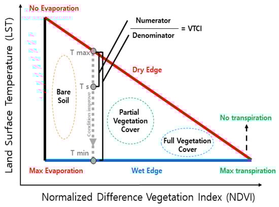 Concept of Vegetation Temperature Condition Index (VTCI) in the LST-NDVI feature space.