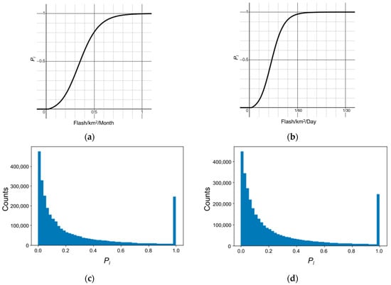 Optimization of the ignition probability conditional on lightning frequency: (a) original probabilities at a global scale, (b) optimized probabilities for South Korea, (c) probability distribution calculated with monthly dataset and the original parameters, (d) probability distribution calculated with daily dataset and the optimized parameters.