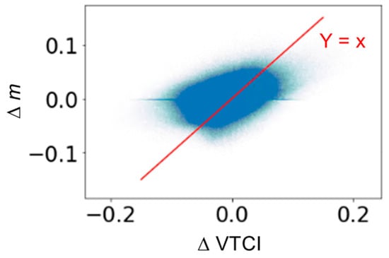 By fitting the iso-value lines of the VTCI using Equation (11), the scale of m and the VTCI were matched in such a way that the daily fuel moisture change in both indicators corresponds to each other (Figure 9). As the two different indicators exploit different types of data, a mismatch at a local level is inevitable. However, when the difference between m and the VTCI is projected in the ∆m—fractional vegetation cover (Fr) data space, where Fr is calculated by squared normalized NDVI [43], the fuel moisture increment was greater in the FFMC algorithm as compared to the VTCI, especially when Fr is lower and the changing amount is greater (Figure 10); therefore, the rate of fuel moisture change in the FFMC needs to be slowed down to be compatible with the remotely sensed moisture content.