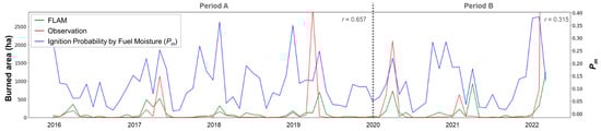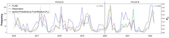 To validate the optimization performance, the historical forest fire frequency and burned area were simulated using the dataset from January 2016 to March 2022. We used the standard from FLAM without calibrating the suppression efficiency [22]. To assess the performance, Pearson’s correlation coefficient (r) was computed between FLAM simulations and observed data, with the dataset split into two periods: period A, which was used for the optimization (before 2020), and period B (after 2020) to test the model’s generalization over time.