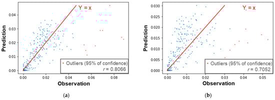 The simulation of the forest fire frequency was also evaluated in a spatial extent by aggregating the frequency value to a 25 km by 25 km grid. Figure 13 shows the spatial evaluation in periods A and B with the grids within a 95% confidence level recording the r of 0.8066 and 0.7052, respectively. The evaluation results show that the optimized FLAM is able to reproduce the forest fire patterns in South Korea, showing good correlation to historical records, particularly for forest fire frequency. The evaluation results did not show a substantial difference between periods A and B. Therefore, the model is expected to be robust with respect to time periods, including possible projections of future fires. However, several outlier grids have been found in the spatial evaluation and all of the outliers were commonly underestimations in the region where a high forest fire frequency was observed.