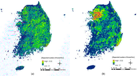 The underestimated forest fire frequency can be located by comparing the maps of the expected number of forest fires (Figure 14). In the FLAM simulation, the expected frequency of forest fires was calculated as the cumulative sum of P. The observational expected frequency was obtained by interpolating forest fire location points with the kernel density of ArcGIS software, to match the maximum expectation range with FLAM. The result of the optimized FLAM presents a smaller scale of undispersed hotspots near cities as compared to the observations, which indicates that the underestimated outliers were on the outskirts of cities. In addition, the prediction showed a relatively higher value through the linear feature of major mountain chains and near the cities, generating a varied scale of hotspots.