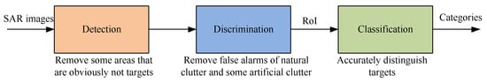 Compared with optical sensors, Synthetic Aperture Radar (SAR) can obtain high-resolution images all day and under any weather. Thus, SAR is widely used in military and civilian sectors. The purpose of SAR ATR is to automatically recognize important targets (vehicles, ships and aircraft), which is the key technology of reconnaissance [1,2]. Lincoln laboratory proposed a three-level flow chart of SAR ATR [3], which includes detection, discrimination and classification, as shown in Figure 1.