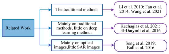 As far as we know, there are seven papers [9,11,12,13,14,15,16] which are related to our work to some extent. We divided them into three directions, as shown in Figure 3. They are as follows: (1) reviews on traditional methods; (2) reviews mainly on the traditional methods, while the deep learning methods are not reviewed thoroughly; (3) reviews mainly on the optical images, while SAR images are not reviewed thoroughly.