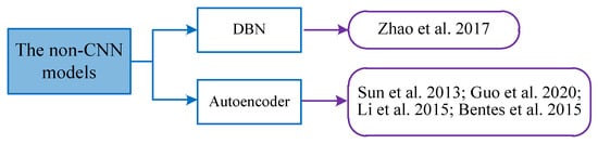Before the success of CNN, many non-CNN deep-learning models were used in feature representation as shown in Figure 9. For example, restricted Boltzmann machine (RBM) [35], Deep Belief Network (DBN) [36], auto-encoder and so on. RBM consists of two shallow visual and hidden layers, which are fully connected with each other. It learns the probability model from input data. DBN is composed of multiple RBM stacks. It uses a layer-by-layer unsupervised method to learn parameters. It can solve the problem of many hidden layers and difficult-to-optimize models. It can train deep networks and lay a foundation for the results of deep learning. Auto-encoder renders the input and output more similar. It is an unsupervised learning process which is mainly used for data dimension reduction or feature extraction.