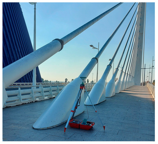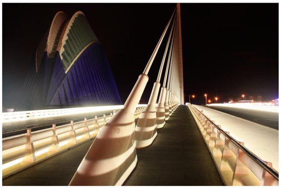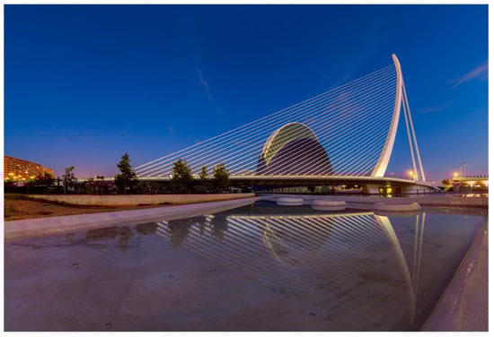 The bridge case used in this study is the Assut de l’Or bridge, which is located in Ciudad de las Artes y las Ciencias, Valencia, Spain (see Figure 1 and Figure 2).
