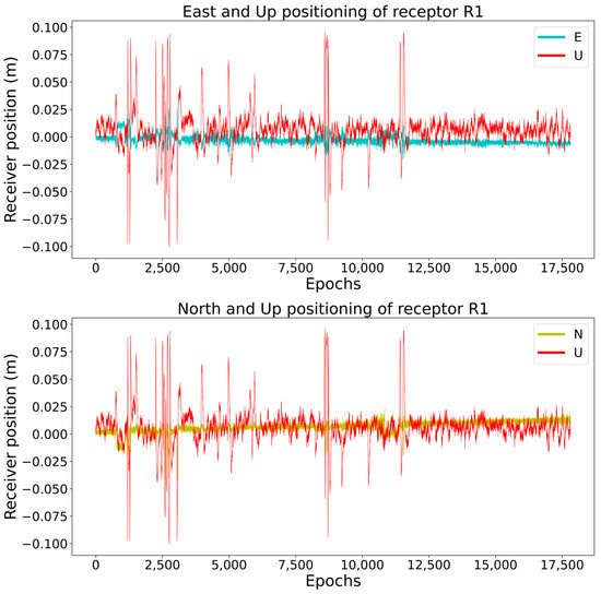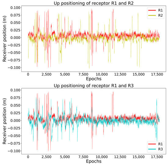 Positioning in the vertical (U) direction of receptors R1 and R2 (top) and receptors R1 and R3 (bottom). The receiver operated at 10 Hz.