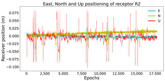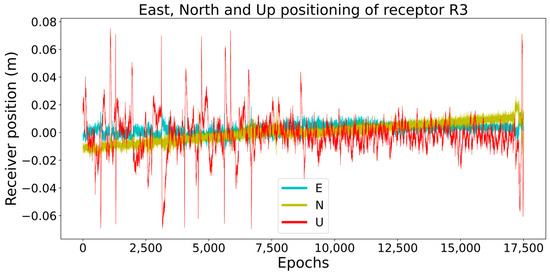 Table 2 presents the mean, as the average or arithmetic mean, of the all-standard deviations associated to every position for the 30 min period. Each standard deviation is obtained from Equation (20). Means of the all-standard deviations (, north , and up ) associated to every position for a 30 min period.