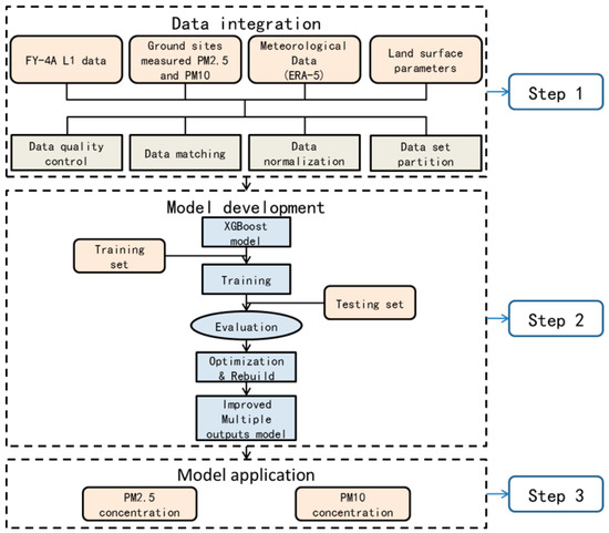 In this research, the positive correlation between PM2.5 and PM10 concentration was considered, and the XGBoost model was improved and rebuilt to estimate the concentrations of PM2.5 and PM10 synchronously. Figure 2 shows the procedures of the estimation model, which includes the following three steps: