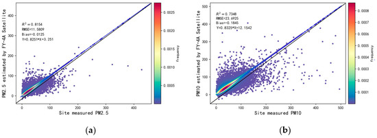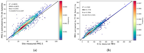 The scatter plots for cross-validation of (a) PM2.5 and (b) PM10 concentration results. The color represents the data frequency.