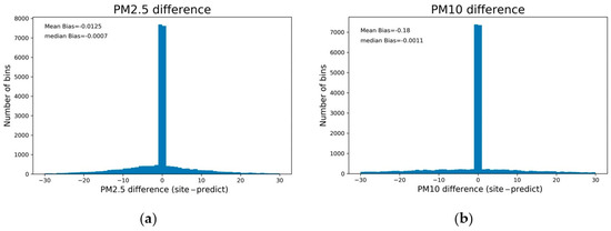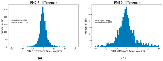 The difference histogram of monthly mean (a) PM2.5 and (b) PM10 concentration between satellite-based estimation and ground-based site measurements in March 2022.