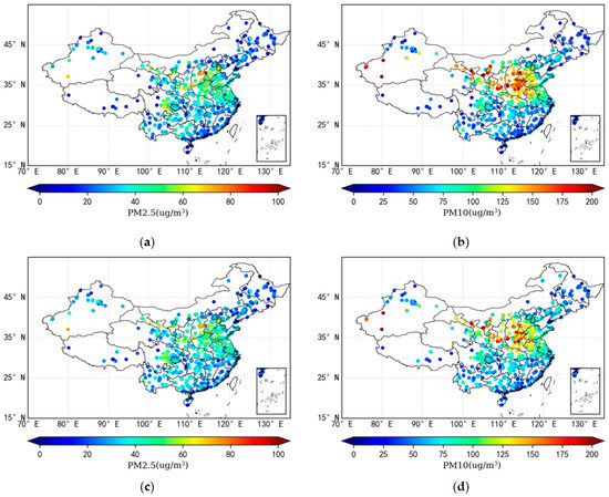 The distribution maps of ground-based site-measured monthly mean (a) PM2.5 and (b) PM10 concentrations, and satellite-based estimated monthly mean (c) PM2.5 and (d) PM10 concentrations in March 2022.