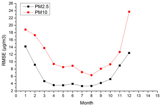 The monthly RMSE variation of FY-4A/AGRI estimated PM2.5 and PM10 concentrations.