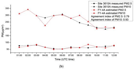 Figure 11 shows the time series observation and estimation of particulate matter concentrations over ground-based sites 1029A (Figure 11a) and 3615A (Figure 11b) on March 10 and April 20 separately. The result shows that concentrations of PM2.5 and PM10 estimated by FY-4A/AGRI highly agreed with the ground site-measured results in time series (with the agreement index of 0.93 and 0.79 for PM2.5, 0.96 and 0.93 for PM10 on March 10 and April 20 over ground sites 1029A and 3615A, respectively), which accurately monitor the development process of ground level particulate matters during haze and dust storm cases. The analysis and statistics of the results showed that PM2.5 accounted for about 50% of PM10 over haze regions, and about 25% over dust storm regions; this indicates that the particulate matter is mostly fine particles over haze regions and mostly coarse particles over dust storm regions.