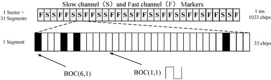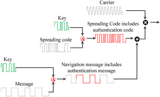 The spreading code authentication is constructed by adding an unpredictable spreading code to the spreading code sequence. Figure 3 is a GPS CHIMERA authentication spreading code design [24], and the Beidou navigation spreading code authentication design needs to have the following requirements: First, it can be compatible with the existing Beidou signal structure and will not affect the existing signal processing. Second, it is designed to take into account both fast channel authentication and slow channel authentication.