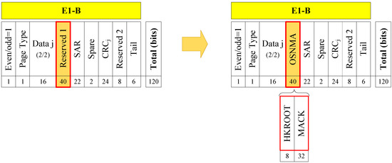 For the GNSS anti-spoofing problem, the common method is to add more sensors [5,6], more antennas, and more complex algorithms [7,8] into the user terminal to improve the user’s anti-spoofing ability. Satellite navigation signal authentication technology is an anti-spoofing technology on the GNSS system side [9]. By adding cryptographic markers to satellite navigation signals, the receiver can verify whether the satellite navigation signals are from real satellites and whether the signals/messages have been tampered with [10]. At present, the construction of four major global navigation satellite systems has been completed. The addition of navigation signal authentication services requires appropriate modifications to the existing satellite navigation systems. On the one hand, it involves the existing system architecture, Interface Control Document (ICD), and cryptographic standards of various countries, and it is necessary to take into account the existing system design. On the other hand, GNSS has been applied on a large scale, and the navigation signal authentication service cannot affect the existing navigation and positioning service. The Galileo System announced the navigation authentication service plan in 2016, providing Open Service Navigation Message Authentication (OSNMA) [11,12] at the Galileo-E1B. The test signals are now available, and formal services will be provided in 2023 [13]. The Japanese Quasi-Zenith Satellite System (QZSS) [14] and the Navigation with Indian Constellation (NavIC) [15] have both performed the on-orbit testing and verification of navigation message authentication technology. In addition, the United States has proposed the concept of Chips Message Robust Authentication (CHIMERA), and plans to carry out technology tests in 2023 on Navigation Technology Satellite-3 (NTS-3) [16].