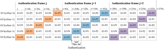 The standard positioning service of BDS includes B1C and B2a. Taking BDS B1C as an example [73,74], the authentication message bits are reserved in advance for Galileo E1, and B1C needs to design a new authentication message frame—subframe 3 adds page 5. The B1C message frame broadcast period is 18 s, and the authentication period is 90 s, which is much longer than the Galileo authentication period (10 to 30 s). The Beidou constellation adopts the cross-authentication method and the authentication message frame offsets the transmission mechanism, which is expected to increase the authentication period to 18 s. The cross-authentication method is that Beidou satellites not only provide their own authentication information, but they also provide the authentication information of adjacent satellites. The authentication message frame offset transmission mechanism refers to the time-sharing broadcast of each satellite message authentication frame (subframe 3, page 5); that is, each satellite broadcasts a different message frame at the same time, which is different from the existing Beidou satellite broadcast strategy. There are huge challenges from the perspective of project implementation. The details of the authentication message offset transmission are as follows in Figure 12.