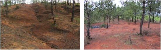 Understory vegetation (shrubs and grass under tree canopies in a forest system) plays an important ecological role in maintaining the diversity of an ecosystem, the stability of ecosystem services and the circulation of nutrient elements, and has a great impact on preventing soil erosion [1,2]. In southern China, the red soil region is a typical soil erosion area (Figure 1). After years of management, there is a significant increase in forest coverage, but many of the forested areas are still suffering moderate or even intense soil erosion [3]. This kind of soil erosion is characterized by barren and acid red soil, hilly landforms, significant precipitation, lack of understory vegetation, and dominant plants with poorly developed roots and canopy, sometimes showing coexistence with dense forests and serious soil erosion [4]. The reason can be traced back to the middle of the last century when human activities caused devastating damage to vegetation and almost destroyed the entire original ecosystem. Surface vegetation reduces water-induced soil erosion by intercepting runoff, increasing water infiltration, and retarding flow velocities [5]. Without the protection of vegetation, the soil humus layer is lost, leaving only barren and acid red soil [6,7]. The process of recovery is slow and full of difficulties. The barren soil in the eroded area cannot breed a healthy shrub-grass layer, and conversely, few dominant species can replenish fertility. Sorriso-Valvo et al. [8] found that ground plant cover is more effective than canopy cover in controlling runoff and erosion. Therefore, the control of soil erosion under forests now becomes one of the main tasks of soil erosion control in southern China.