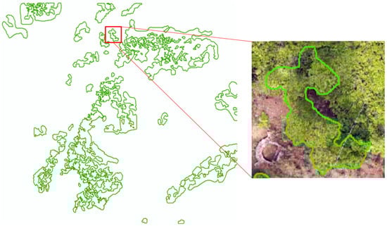 The boundary area, without understory vegetation, is drawn on the image through a field survey in August, after the UAV flight. While conducting the field investigation, we used ArcGIS10.2 (ESRI, Redlands, CA, USA) overlay DOM images to sketch the category area with no understory vegetation. For the area covered by vegetation, the ground truth can only be determined by field investigation. The 3D scene model is used to check the ground truth. Figure 3 shows the ground truth of Area 1, and the areas in the green closed curves represent the areas without understory vegetation.