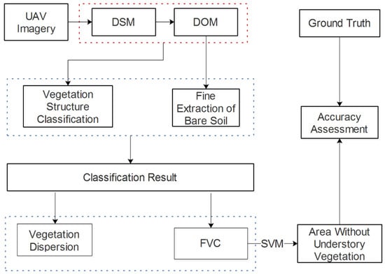 Process of the research. DSM: digital surface model, DOM: digital orthophoto map, FVC: fractional vegetation coverage; SVM: support vector machine.