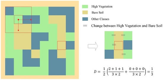 In the high-resolution remote sensing image, we can see the exposed soil in the canopy area. This exposed soil does not distribute continuously but is discretely scattered among the forest canopy in the high vegetation area. We use the average number of change times between the bare soil and high vegetation in the neighboring area as the dispersion index. The higher the vegetation dispersion, the more likely the understory bare soil exists. The discreteness index is defined as [20]: