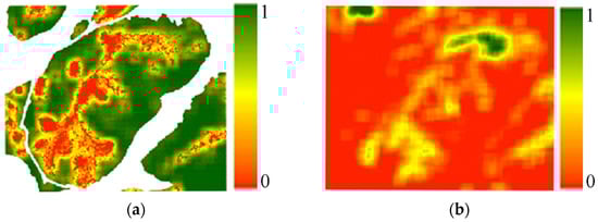 To avoid the interference of non-forest land types on the extraction results, the study only extracts the vegetation coverage in forest areas. The extracted FVC reflects the surface vegetation coverage. When the vegetation around the pixel is dense, the FVC value is higher, and when there is more bare soil around the pixel, the FVC value is lower. A value of 1 indicates that all pixels in the neighborhood are vegetation, and a value of 0 indicates that all pixels in the neighborhood are bare soil. The vegetation coverage increases with vegetation density. The area with high vegetation dispersion shows violent fluctuation in FVC. Figure 8 shows the vegetation coverage and dispersion when the window size is 501. It can be seen that two factors show some differences: the pixel with high vegetation coverage may not have high vegetation dispersion. This indicates that the correlation between the two factors is not high, and they have different information that can be used to estimate the understory vegetation.