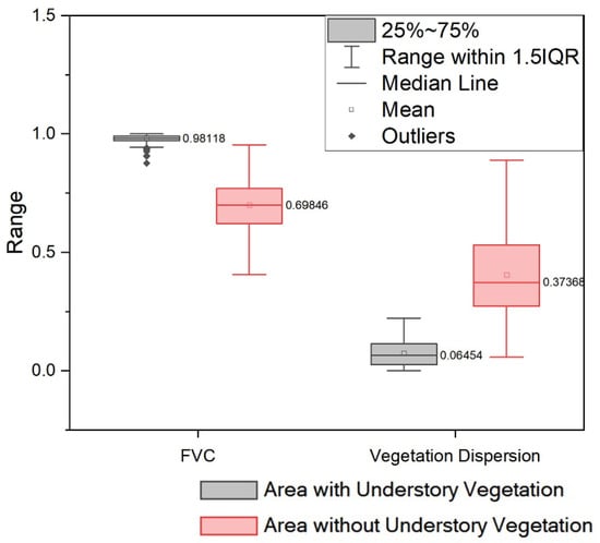 Box Plots of FVC and vegetation dispersion, calculated by sample points we selected. The FVC of the area with understory vegetation and the area without understory vegetation ranged between 0.97 and 0.99, and 0.69 and 0.76, respectively, and the median of each is 0.98 and 0.70. The vegetation dispersion of area with understory vegetation and area without understory vegetation range between 0.07 and 0.11, and 0.40 and 0.53, respectively, and the median of each is 0.05 and 0.37.