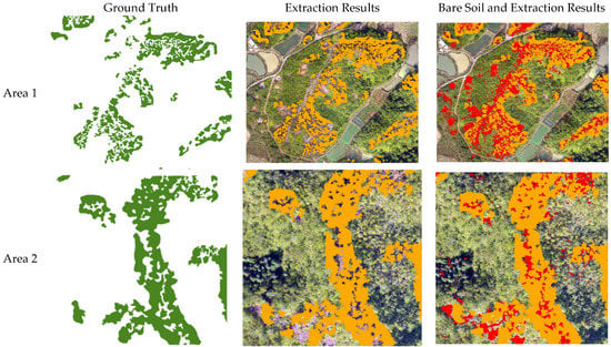 Extraction result of the study area (the green, orange and red color area represents ground truth, area without understory vegetation and bare soil, respectively).