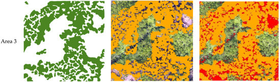 Vegetation coverage results are shown in Table 3. The vegetation coverage calculated by the conventional method of the three areas is 72.28%, 97.15% and 89.95%, respectively. While the vegetation coverage with undergrowth vegetation is 51.88%, 77.17% and 48.29%, respectively. Vegetation coverage without undergrowth vegetation is 20.40%, 19.98% and 41.69%, respectively.