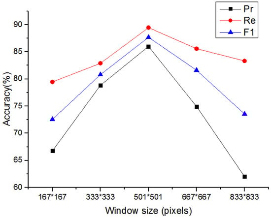Extraction accuracy of different window sizes (in the horizontal axis, 167*167, 333*333, 501*501, 667*667, and 833*833 represents pixel number of the length and width of the window are all 167, 333, 501, 667 and 833, respectively).