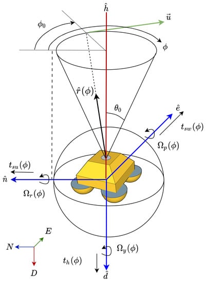 where , is the tilt angle already defined in Equation (19). is shorthand notation for “roll”, “pitch”, and “yaw”.