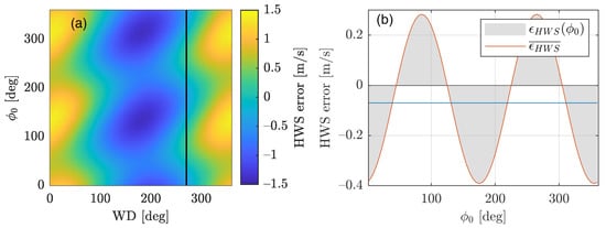 Example of the estimation of the total error in a LiDAR scan ( m/s, m/s, and a ranging from 0 to 360 deg, roll-only motion). (a) Color plot of the error as a function of the wind direction, , and initial phase, . (b) error for deg (vertical black line in panel (a)) as a function of the initial phase. The blue horizontal line indicates the mean error.
