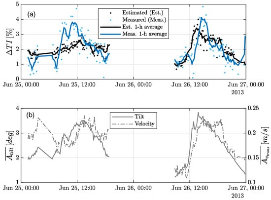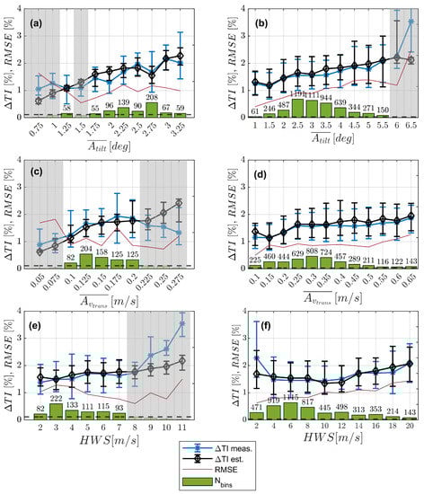 The motion-induced variance in FDWL measurements is encountered at higher wind statistical moments, such as the turbulence intensity () []. The is defined as the ratio between the standard deviation of the horizontal wind speed () and the mean . In the presence of the wave motion, FDWLs measure an apparent added turbulence due to the motion-induced variance, which corrupts the measurements [,]. is one of the parameters of main importance for wind farm design and operation, as wrong estimates of could lead to turbine overdesign or malfunctioning [] and thus higher costs.