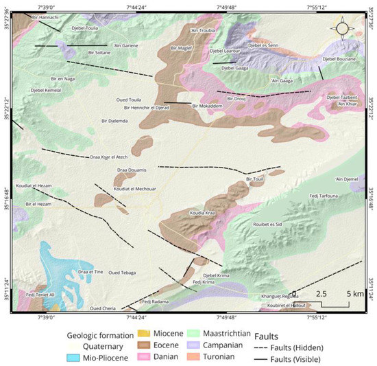 The Cheria basin is situated in the southwestern part of Tebessa within the northeast province of Algeria between the latitudes of 35°18′41,62″ and 35°14′51,30″N and longitudes of 7°42′51,40″ and 7°47′34,62”E (Figure 1). The basin is surrounded by mountain ranges with an elevation exceeding 1000 m, with some areas at elevations of up to 1200 m, such as Djebal Achour and Djebal Dokkan in the east; Djebal Zora and Djebal Boukammech in the south; Djebal Troubia and Djebal Tazbent in the north; and Djebal Kamallel and Djebel El Abtine in the west.