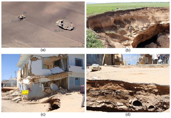 Sinkhole example images: (a) Draa-Douamis sinkholes 1 and 2 collapsed with a diameter of 66.47 and 24.88 m, respectively (location: see Figure 1—sinkhole sites; date: during 2004); (b) example of sinkhole diameter enlargement in surface; (c) Harkat Bouziane sinkhole collapsed in the city with a diameter of ~50 m and height of 2 m (location: see Figure 1—sinkhole sites; date: February 2009), destroying infrastructure; and (d) damage created by a sinkhole event (i.e., sewer network and roads broken).