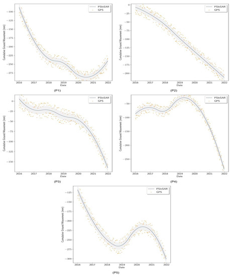 Graphs of the cumulative deformation of the selected points (P1, P2, P3, P4, and P5) from PSI and GPS results used to detect subsidence; the x-axis is time, 2016–2022, and the y-axis represents the movement of the ground.