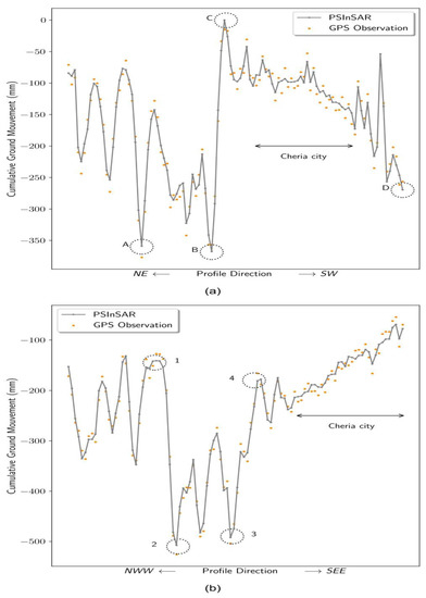 An overview of eight sites selected from cumulative vertical ground movement profiles is presented in Figure 8, with personalized zoom to monitor the total displacement resulting from over five years of analysis. For further detail, in Figure 8b,c, the selected points A and B represent areas facing serious land subsidence highlighted in the map, with a sub-circular shape of the total value reaching more than −350 mm. In Figure 8c,d, point C is situated near the urban perimeter and is represented on the map by near-zero vertical movements that indicate relatively stable zones. Point D suggests a medium to high land subsidence, with a value reaching −270 mm; while in Figure 8e,f, points 1 and 4 refer to ground subsidence with values between −140 and −170 mm, respectively. On the other hand, points 2 and 3 represent areas with the highest land sinking values registered during the analysis period, at more than −490 mm. GPS distribution is very similar to the InSAR deformation field.
